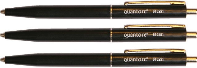 De Quantore drukknop zwart medium balpen is een uitstekende keuze voor zowel zakelijke bedrijven als particulieren die dagelijks schrijfwerk verrichten. Dit functionele kunststof model biedt een combinatie van comfort en duurzaamheid. De metalen clip, drukknop en punt dragen bij aan een stevige en professionele uitstraling. De houder is in dezelfde kleur als de inkt, waardoor het eenvoudig is om de juiste pen te grijpen. Met een soepele medium schrijfbreedte van 0,7 mm levert deze balpen een consistente en heldere lijn. Bovendien is de pen navulbaar met een standaard DIN-vulling, wat bijdraagt aan de duurzaamheid. Deze balpen is geschikt voor gebruik op school, kantoor of thuis en biedt betrouwbare prestaties.