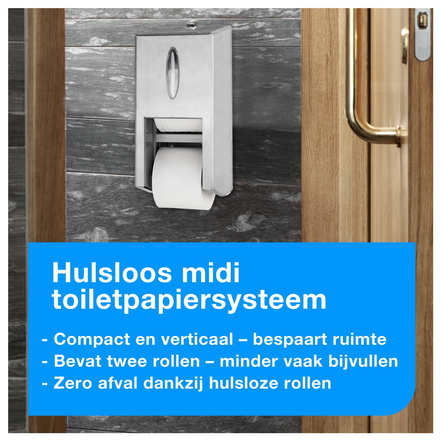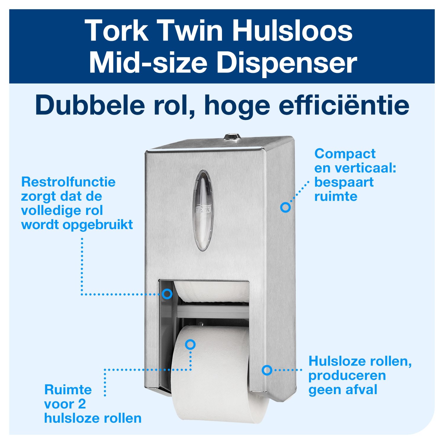 De Tork OptiServe® Hulsloos Dispenser is een innovatief toiletpapiersysteem dat speciaal is ontworpen voor faciliteiten waar efficiëntie, duurzaamheid en gebruikservaring centraal staan. Met een hoge capaciteit en een compact ontwerp neemt deze dispenser minder ruimte in beslag en biedt het een beter alternatief voor traditioneel toiletpapier en jumbo toiletrollen. De dispenser is gecertificeerd ‘Easy-to-use’, wat de gebruikservaring voor zowel bedrijven als particulieren verbetert.