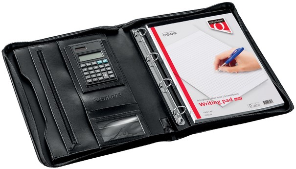 Dankzij de vele insteekvakken heeft u altijd alles overzichtelijk bij de hand. De penlus, het schrijfblok en de geïntegreerde calculator maken het mogelijk om snel te noteren en te rekenen. Met het 4-rings mechaniek beschikt u over een complete, mobiele werkplek.