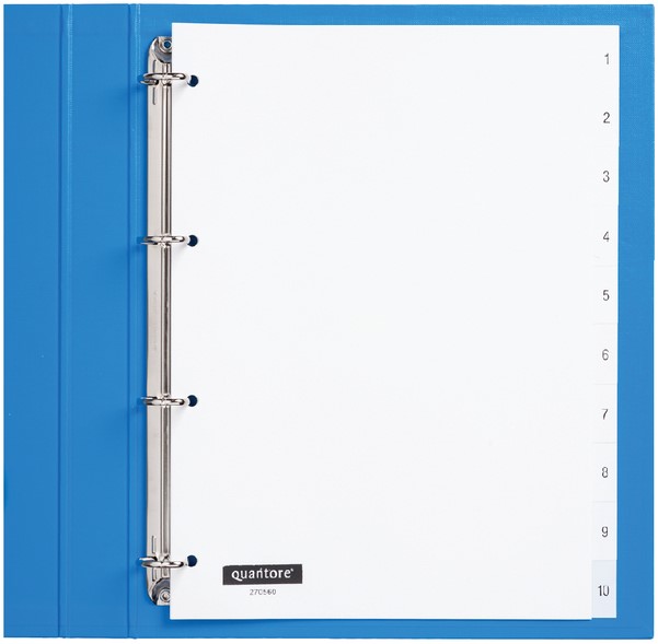 De Quantore tabbladen 4-gaats 1-10 genummerd wit bieden een praktische en duurzame oplossing voor het ordenen van documenten. Deze tabbladen zijn vervaardigd uit stevig ivoorkleurig polypropyleen en zijn ontworpen voor dagelijks gebruik in ringbanden of ordners. De tabs zijn genummerd van 1 tot 10 en eenzijdig zwart bedrukt, wat het terugvinden van informatie eenvoudig maakt. Dankzij de standaard 4-gaats perforatie passen zij in alle gangbare mappen. Deze tabbladen zijn ideaal voor het structureren van rapporten, werkdossiers of studiemateriaal met een professionele uitstraling.