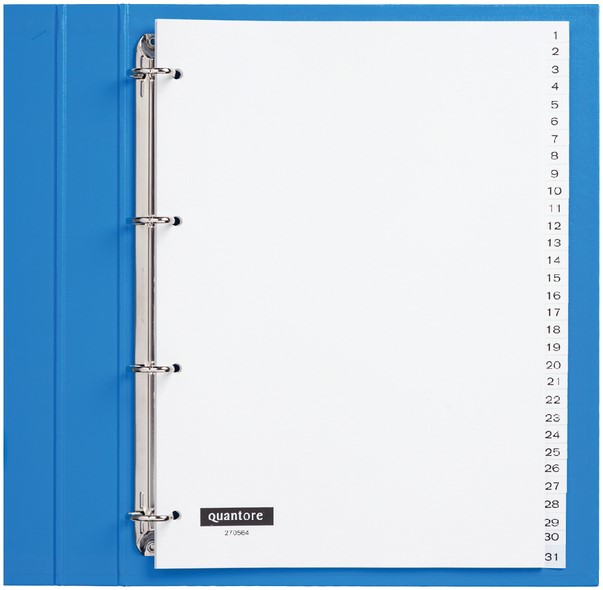 Met de Quantore tabbladen 4-gaats 1-31 genummerd wit brengt u eenvoudig een dagelijkse structuur aan in uw ordners. Deze ivoorkleurige tabbladen zijn vervaardigd uit stevig polypropyleen, waardoor zij bestand zijn tegen intensief gebruik. De duidelijk genummerde tabs, van 1 tot 31, zijn eenzijdig zwart bedrukt en zijn ideaal voor maandelijkse overzichten, planning of administratie. Dankzij de 4-gaats perforatie passen zij perfect in standaard ringbanden, wat zorgt voor een nette en overzichtelijke indeling. Dit product is een praktische en duurzame keuze voor zowel professioneel als persoonlijk gebruik.