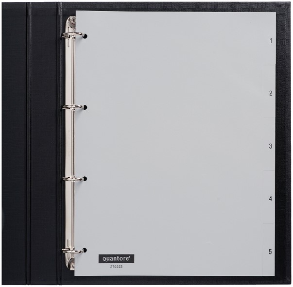 De Quantore tabbladen 4-gaats 1-5 genummerd grijs bieden een efficiënte oplossing voor het structureren van documenten. Deze tabbladen zijn vervaardigd uit grijs polypropyleen, wat zorgt voor een stevige en duurzame kwaliteit, geschikt voor dagelijks gebruik in diverse omgevingen, zoals op kantoor, op school of thuis.