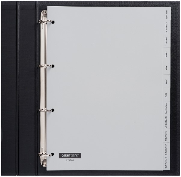 Breng overzicht in uw administratie of planning met de Quantore tabbladen 4-gaats 12-delig met maanden in grijs. Deze duurzame tabbladen zijn vervaardigd uit stevig polypropyleen en zijn bedrukt met de maanden januari tot en met december, waardoor u eenvoudig documenten per maand kunt organiseren. De grijze kleur biedt een professionele uitstraling, terwijl de eenzijdig zwart bedrukte tabs zorgen voor snelle herkenning. Dankzij de 4-gaats perforatie passen deze tabbladen perfect in standaard ringbanden en ordners. Dit product is ideaal voor het bijhouden van maandelijkse rapportages, facturen of projectdocumentatie.