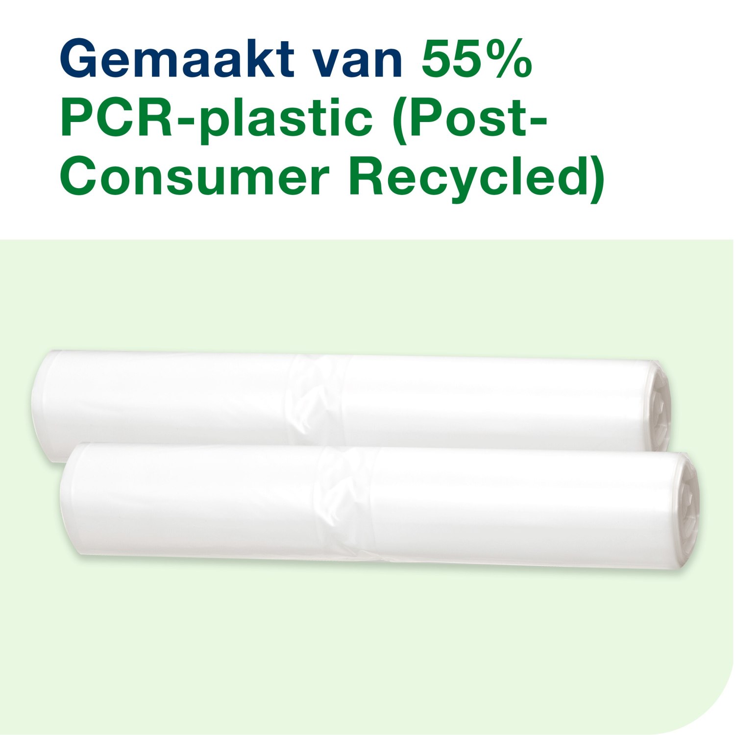 Deze afvalzakken worden geleverd op een handige rol, wat het opbergen en gebruiksgemak vergroot. Bovendien zijn ze voor 55% gemaakt van gerecycled materiaal, waardoor u een duurzame keuze maakt voor uw afvalbeheer. Elke rol bevat meerdere zakken, zodat u altijd voldoende voorraad heeft voor uw behoeften.