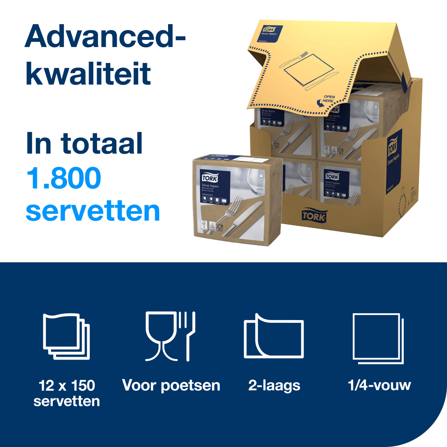 Elke doos bevat 1800 servetten, verdeeld over 12 pakken van 150 stuks, wat zorgt voor een efficiënte en handige voorraad. De Tork Easy Handling doos maakt het openen snel en eenvoudig, zodat je direct aan de slag kunt. Deze servetten zijn niet alleen ideaal voor professioneel gebruik, maar ook voor particulieren die waarde hechten aan kwaliteit en duurzaamheid.