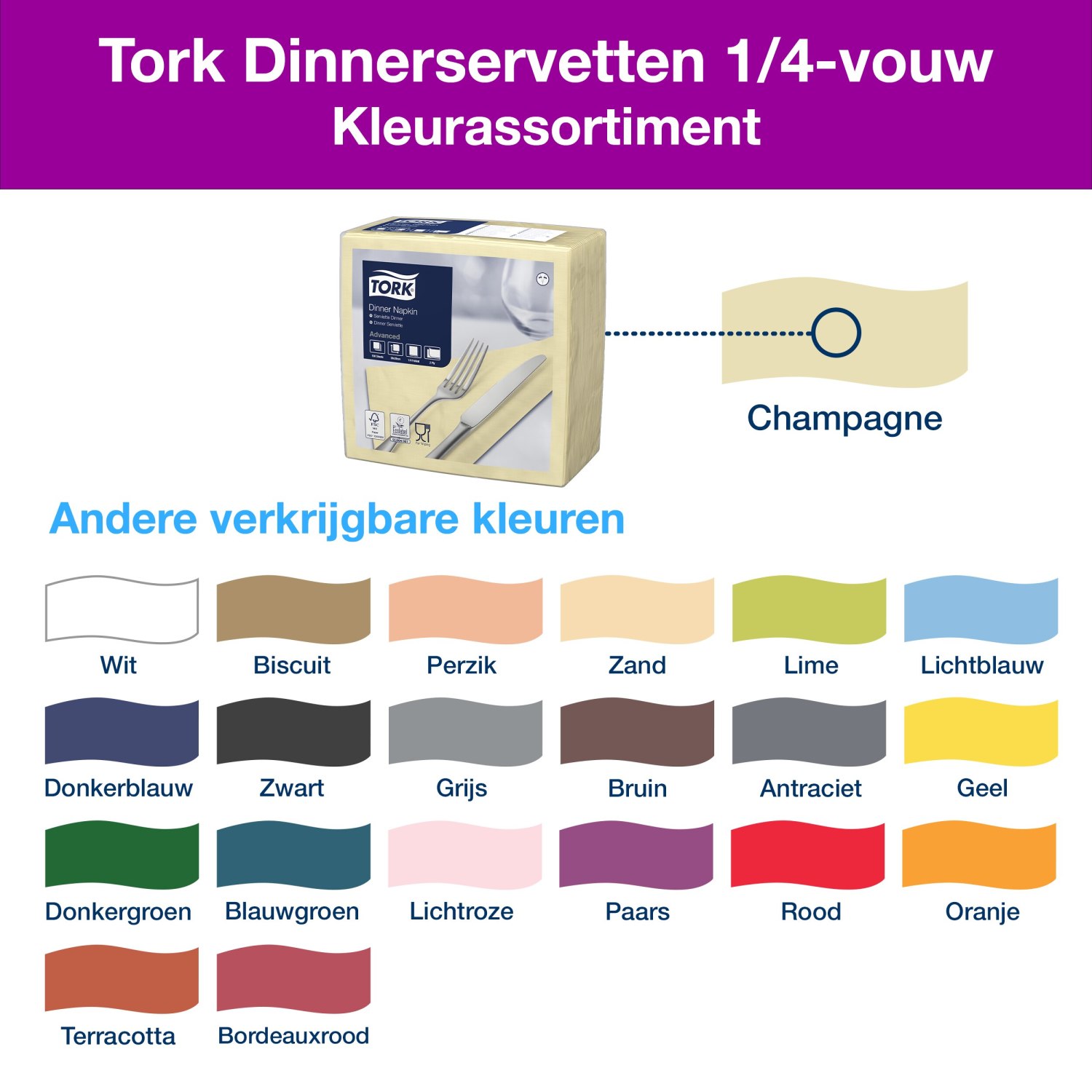 De Tork Dinnerservetten zijn de perfecte keuze voor restaurants, catering en de horeca. Met een afmeting van 39 x 39 cm en een praktische 1/4 vouw bieden deze 2-laagse servetten zowel functionaliteit als stijl. Ze zijn ontworpen om een professionele uitstraling te geven aan elke tafelsetting.
