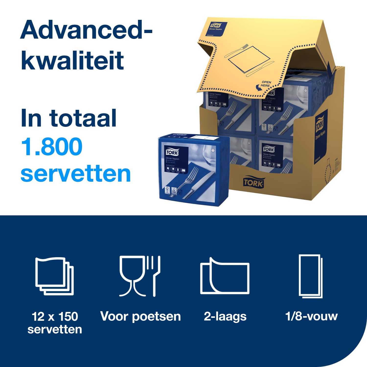 Elke doos bevat 1800 servetten, verdeeld over 12 pakken van 150 stuks, wat zorgt voor een efficiënte en handige voorraad. De Tork Easy Handling doos maakt het openen snel en eenvoudig, zodat je altijd voorbereid bent op elke gelegenheid. Deze servetten zijn ideaal voor zowel bedrijven als particulieren die op zoek zijn naar kwaliteit en duurzaamheid.