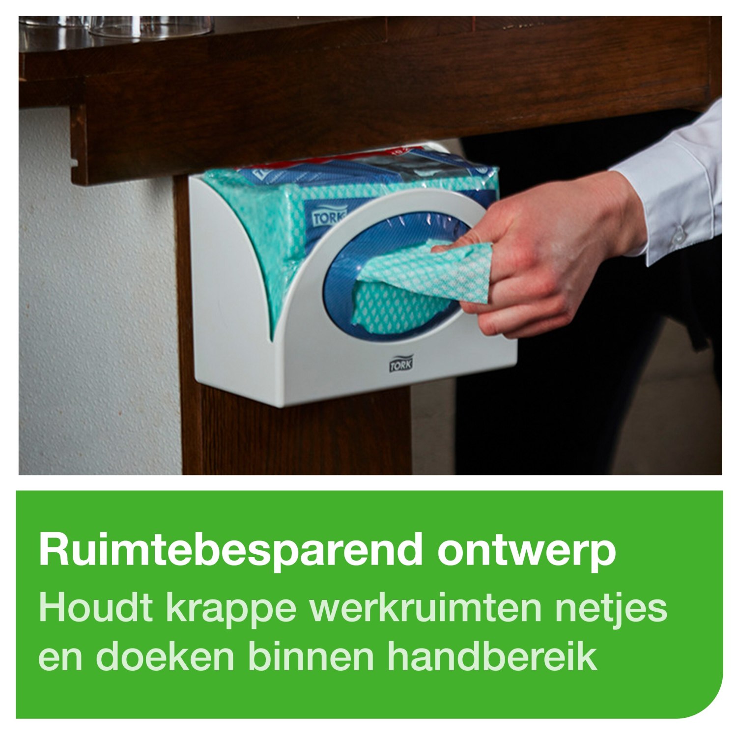 De Tork Dispenser voor Smallpacks is de ideale oplossing voor werkplekken met beperkte opbergruimte voor schoonmaakproducten. Deze muurmontage dispenser zorgt ervoor dat de reinigingsdoeken altijd binnen handbereik zijn, wat werknemers helpt om tijd te besparen. Met een ontwerp dat per keer één doek uitgeeft, vermindert deze dispenser zowel verbruik als afval, wat resulteert in kostenbesparingen voor uw bedrijf of huishouden.