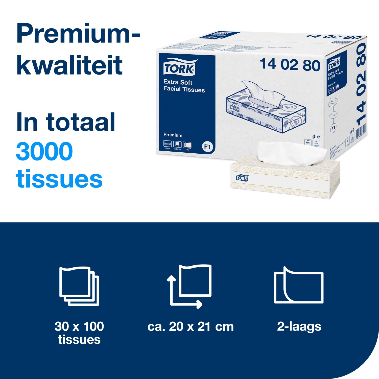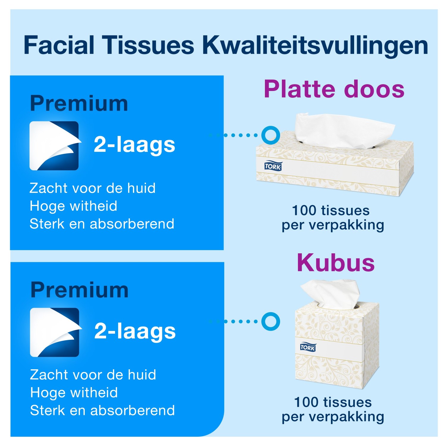 De moderne platte doos is ontworpen om perfect te passen in de Tork Facial Tissue Dispenser. Met een handige papieren opening is de doos ook gemakkelijk te recyclen. Elke doos bevat een specifiek aantal tissues, waardoor ze ideaal zijn voor zowel bedrijven als particulieren die waarde hechten aan kwaliteit en gebruiksgemak.
