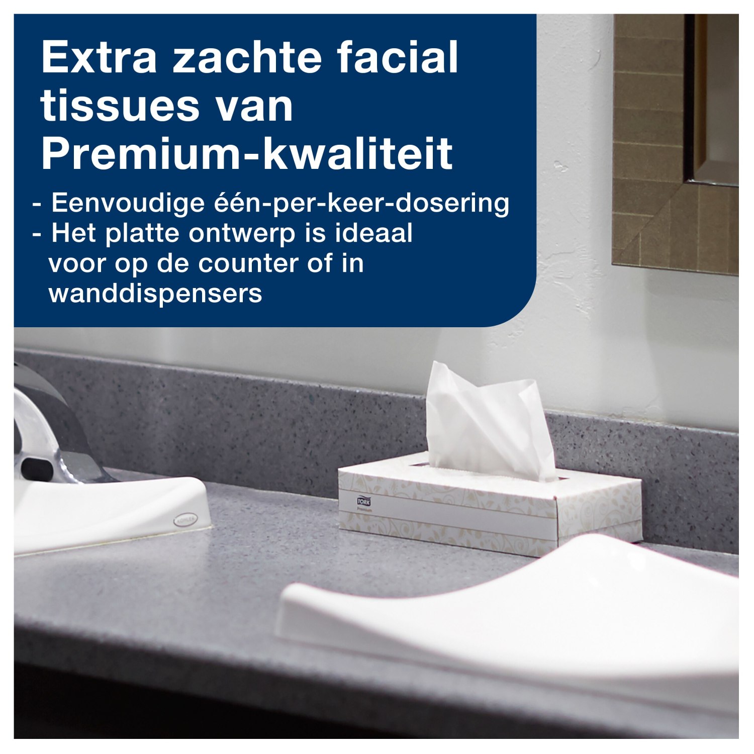Zorg voor een aangename werkplek of sanitaire ruimte in kantoren, het onderwijs en de gezondheidszorg met deze zachte gezichtstissues. Deze tissues zijn sterk, absorberend en helder, en bieden eersteklas comfort en prestaties die gasten zullen waarderen. De compacte doos, die eenvoudig op verschillende locaties kan worden geplaatst, zorgt voor verbeterde hygiëne dankzij de één-per-keer-dosering.