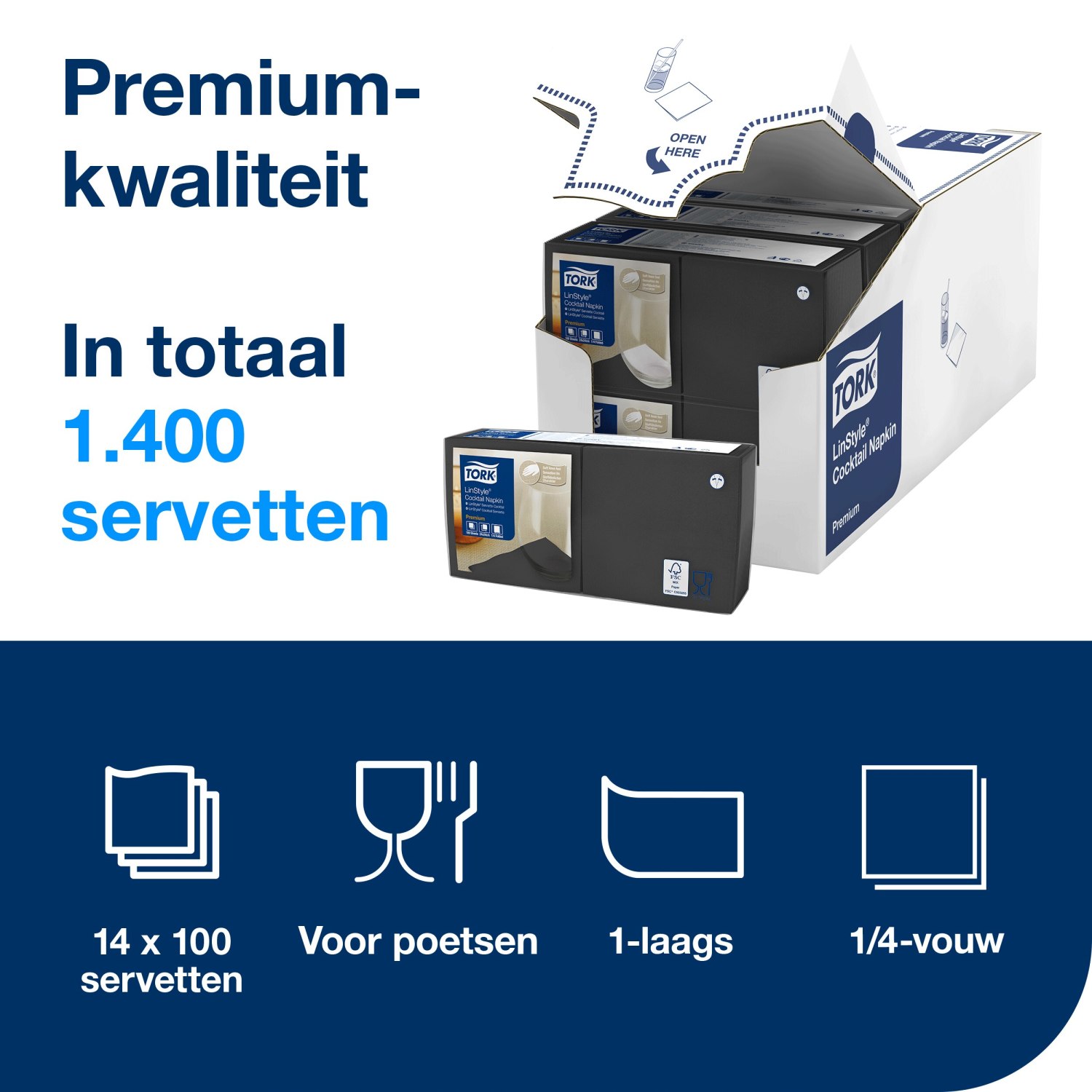 Maak een onvergetelijke indruk met de Tork Linstyle® cocktailservetten, perfect voor het serveren van hapjes en drankjes in bars, restaurants en congresgebouwen. Met afmetingen die ideaal zijn voor elke gelegenheid, bieden deze servetten een luxueuze uitstraling en een voelbaar zachtere, dikkere textuur dan standaard papieren servetten. Uw gasten zullen het verschil zeker opmerken.