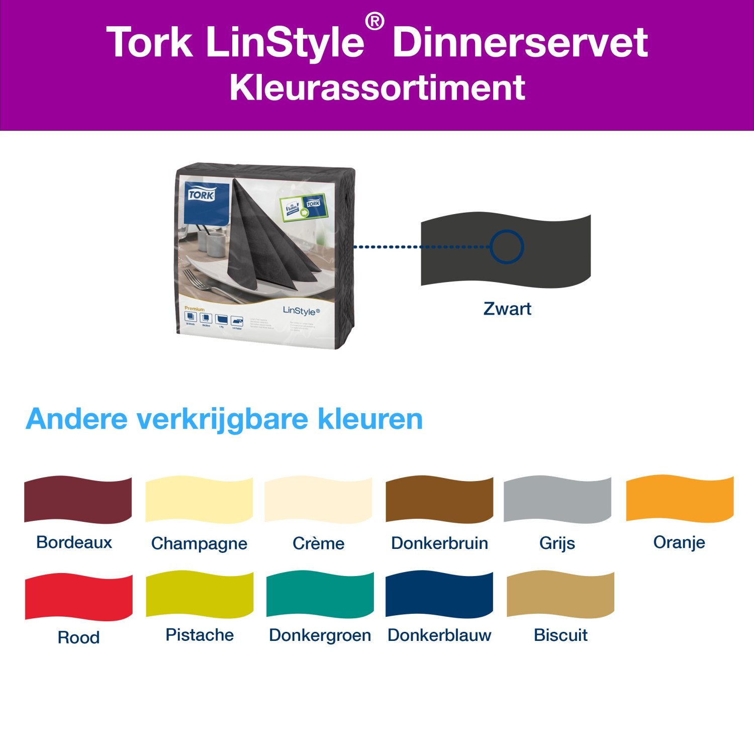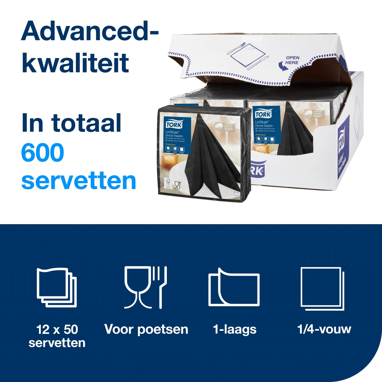Dankzij het extra absorberende design kunnen gemorste vloeistoffen snel worden opgeruimd, wat uw personeel tijd en moeite bespaart. De Tork LinStyle® dinerservetten zijn verkrijgbaar in een verpakking van 50 stuks, ideaal voor zowel restaurants als particuliere evenementen.