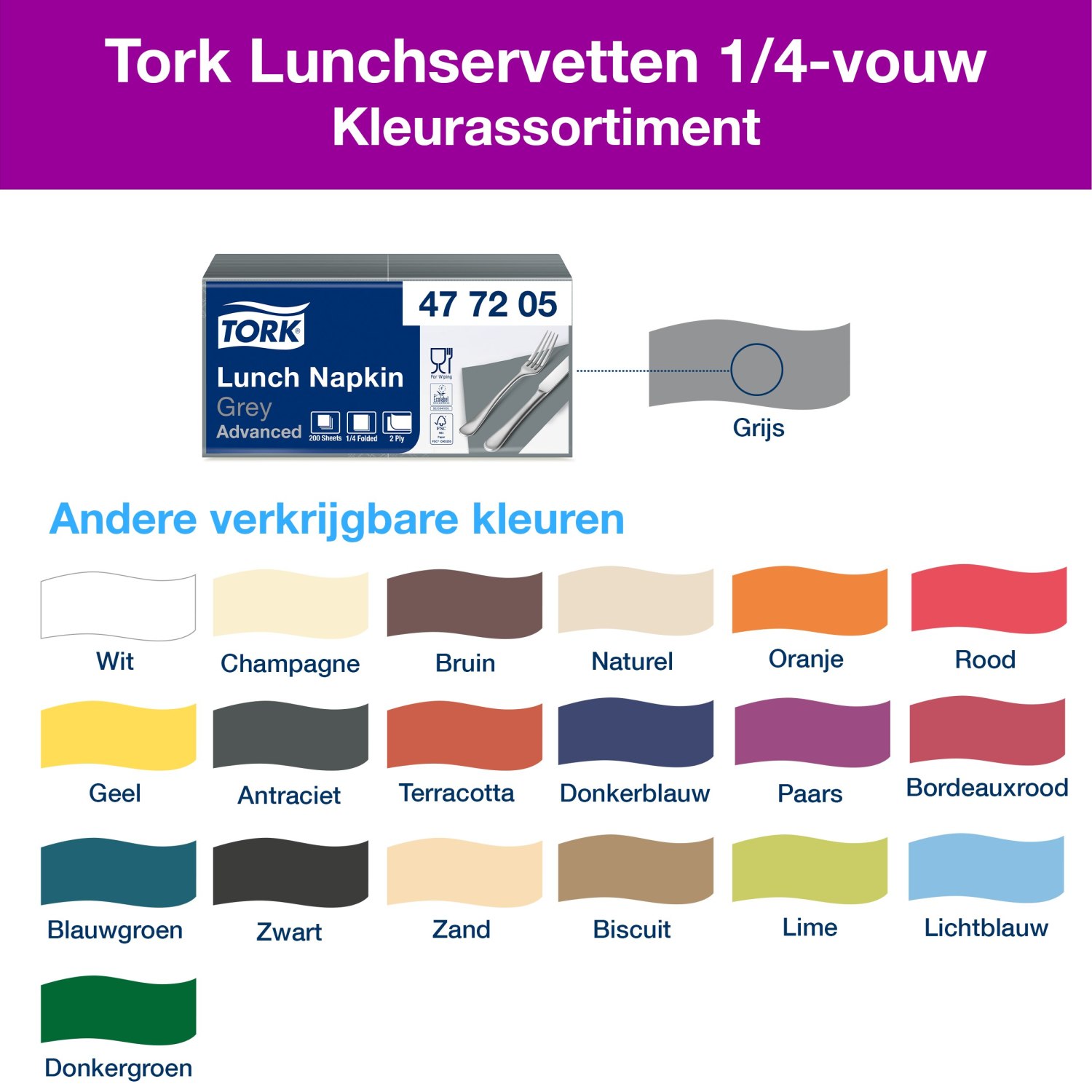 Tork 2-laags servetten, stevig en absorberend, in diverse kleuren.