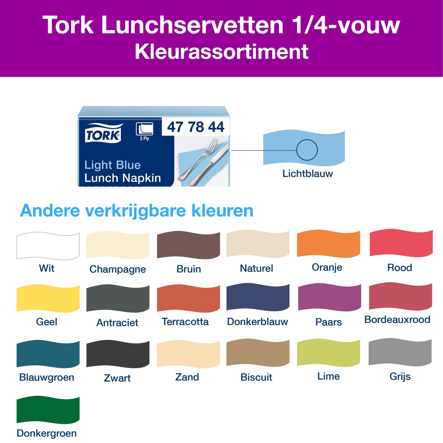 Tork Lunchservetten zijn de perfecte keuze voor restaurants, cateringbedrijven en horecagelegenheden die lichte maaltijden en snacks serveren. Deze zwarte servetten zijn vervaardigd uit 2 lagen en hebben een handige 1/4-vouw. Uitgevouwen meten ze 33 x 33 cm, wat zorgt voor een ruime en praktische gebruikservaring.