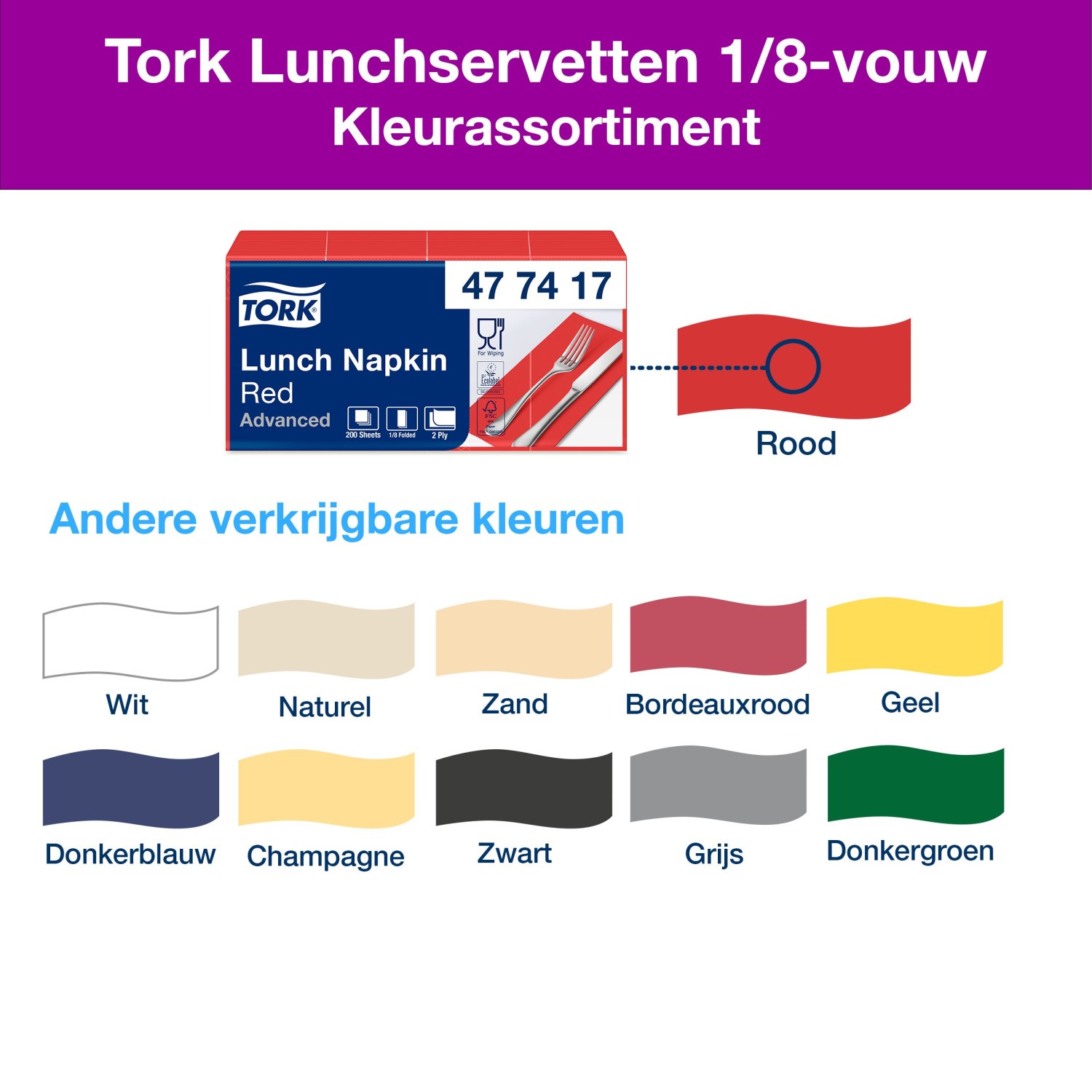 De Tork Lunchservetten zijn de perfecte keuze voor restaurants, cateringbedrijven en horecagelegenheden die lichte maaltijden en snacks serveren. Deze rode servetten zijn vervaardigd uit 2 lagen en hebben een handige 1/4-vouw, waardoor ze eenvoudig te gebruiken zijn. Bij uitvouwen hebben de servetten een afmeting van 33 x 33 cm, wat zorgt voor voldoende oppervlakte voor diverse toepassingen.