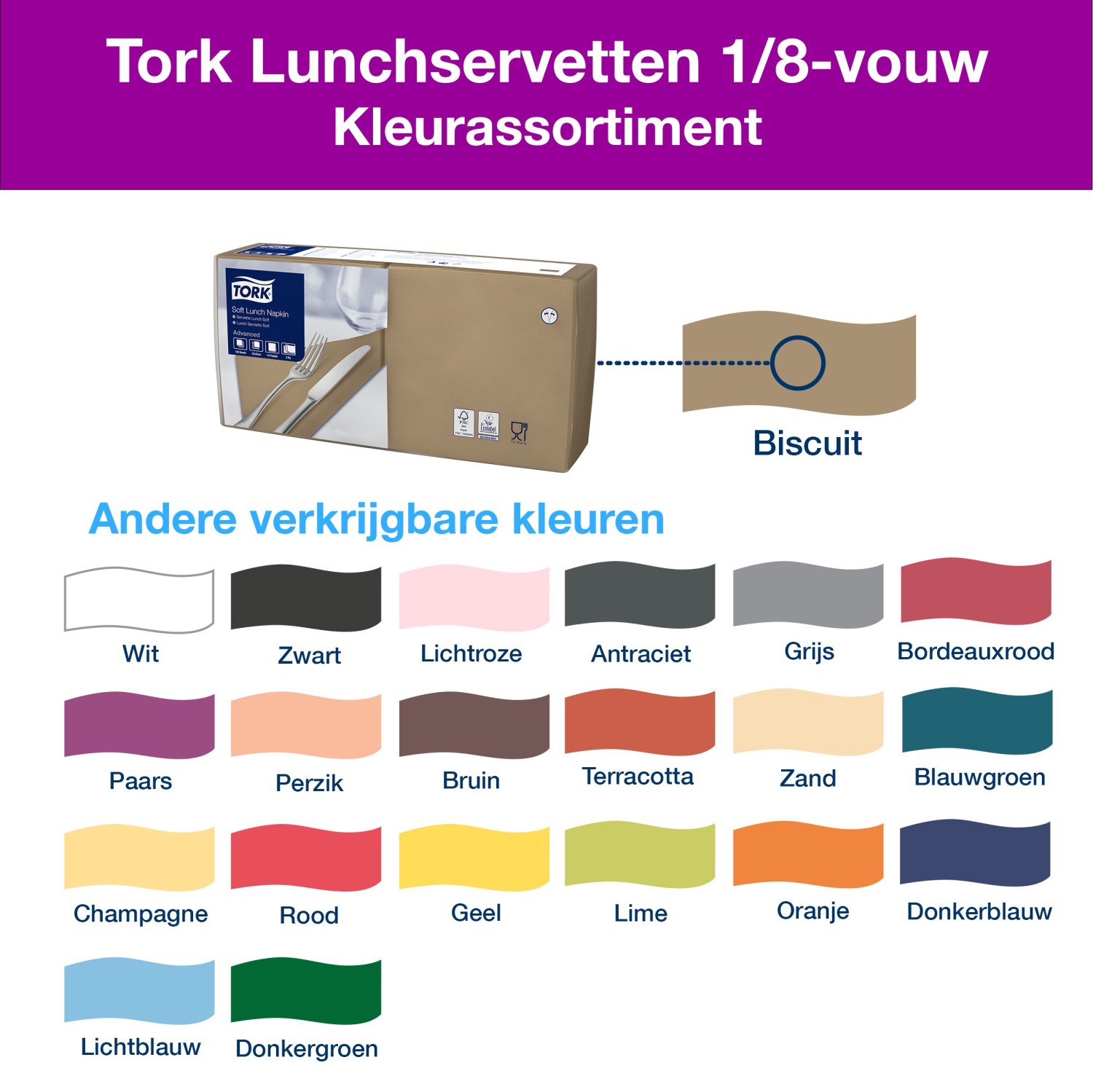 Tork Soft Lunchservetten: 3-laags, absorberend, in diverse kleuren.